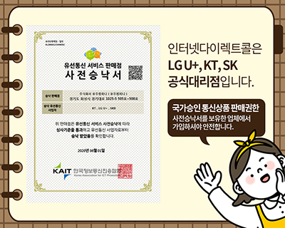 21년동안 175만 201시간이상 고객님의 쉽고 안전한 인터넷 가입을 위해 합리적인 통신설계를 같이 고민하고 쉽고 안전한 인터넷가입혜택을 추천해드렸습니다. 인터넷다이렉트콜은 상위 1차 온라인대리점으로! 통신사와 계약이 되어있어 온라인대리점이면서도 국가가 부여한 통신상품 판매권 사전승낙서는 필수이기에 보유하고있습니다. 사전승낙서를 보유한 업체에서 가입해야 안전합니다!