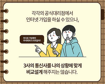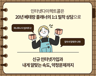 365일 연중무휴 실시간 베테랑 플래너의 1:1 밀착상담으로 내게 처해진 상황에 맞게 내게 꼭 맞는 인터넷을 추천해드리며, 카카오 채팅으로도 쉽고 빠르고 정확한 인터넷가입 안내드립니다.