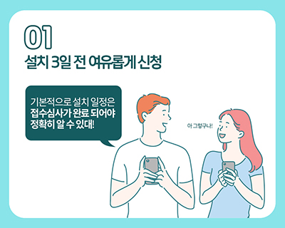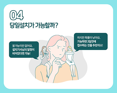 TIP 4. 당일설치 정말 가능할까? 그렇다면, 당일설치가 정말 가능할까요? 불가능이란 없어요. 설치기사님 일정이 비어있다면 우리가 접수만 빨리 하면 일정에 맞춰 조율 할 수 있어요 하지만 확률은 높은 편은 아닌데요 가능하면 3일 전에 미리 접수하는 것을 추천 드리고 있어요.
