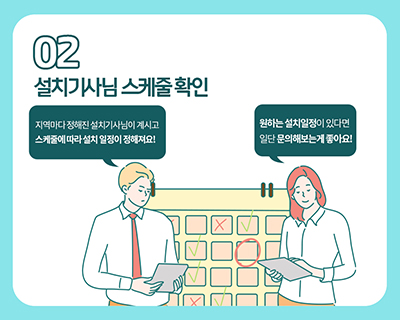 TIP 2. 설치기사님 스케쥴 확인 인터넷 당일설치 두번째는 설치기사님 스케쥴을 확인하는 단계인데요 지역마다 정해진 설치기사님이 계시고 각 기사님의 스케쥴에 따라서 설치 일정이 정해져요 원하는 설치 일정이 있다면 먼저 문의해보는 것이 좋겠죠? 만약, 내가 원하는 날짜와 시간대에 기사님 스케쥴이 맞지 않으면 사실 다른 날짜로 미루거나 당길 수 밖에 없어요