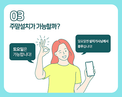 TIP 3. 주말설치는 가능할까? 주말설치는 토요일에는 가능해요^^ 일요일엔 설치기사님 모두가 휴무입니다! 요 점도 참고해서 날짜를 확인해보는 것이 좋겠어요.